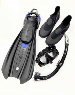 Our Instructors have put together this "Start Up" equipment package for students enrolling on our courses. With so much gear to choose from, these items have been chosen based on comfort, quality, weight and size. Your travel easy kit includes: Aqualung Strap Fins Hard soled boots Aqualung silicon mask & purge snorkel The Strap fins come in a selection of sizes so we can find the best fittin...